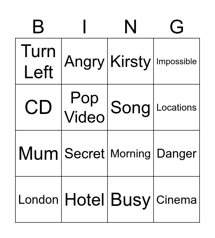 This bingo card has 16 words: Hotel, Danger, Kirsty, Turn Left, Mum, Angry, Morning, Busy, CD, Pop Video, London, Impossible, Secret, Locations, Song and Cinema.