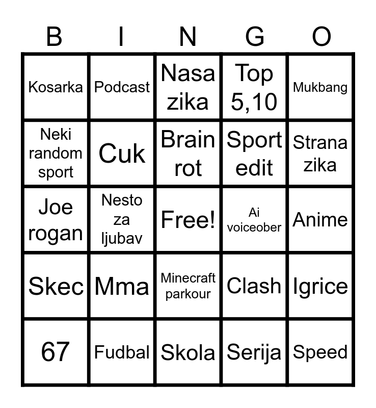 This bingo card has a free space and 24 words: Mma, Fudbal, Brain rot, 67, Mukbang, Kosarka, Neki random sport, Podcast, Ai voiceober, Minecraft parkour, Sport edit, Joe rogan, Clash, Igrice, Cuk, Serija, Anime, Nasa zika, Strana zika, Nesto za ljubav, Speed, Skec, Top 5,10 and Skola.