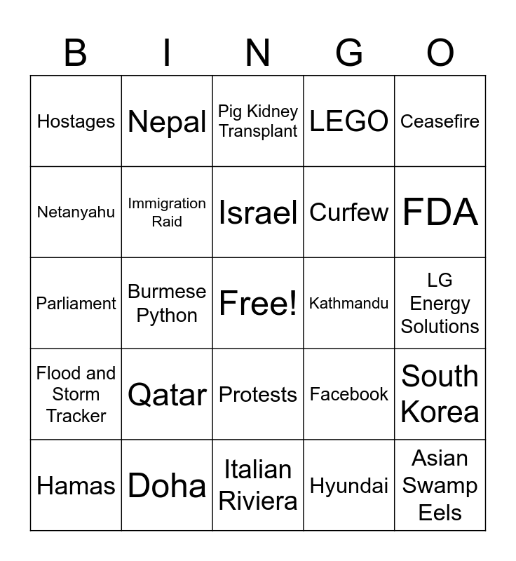 This bingo card has a free space and 24 words: Qatar, Doha, Israel, Hamas, Ceasefire, Hostages, Netanyahu, Nepal, Kathmandu, Protests, Curfew, Parliament, Facebook, South Korea, Immigration Raid, Hyundai, LG Energy Solutions, Pig Kidney Transplant, FDA, Burmese Python, Asian Swamp Eels, Flood and Storm Tracker, LEGO and Italian Riviera.