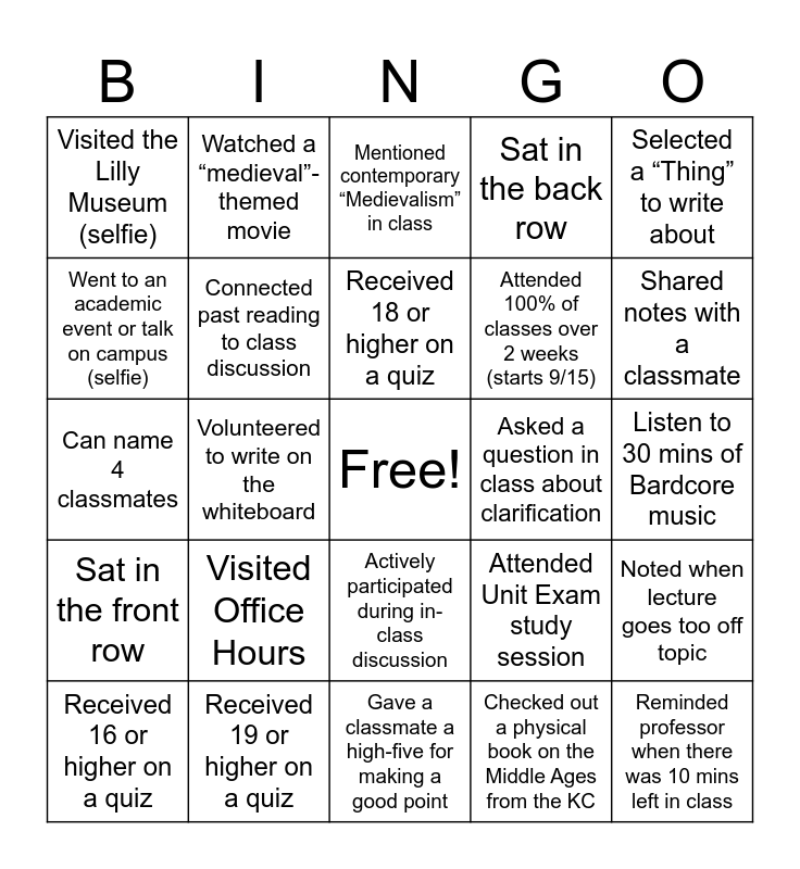 This bingo card has a free space and 24 words: Visited Office Hours, Received 19 or higher on a quiz, Received 18 or higher on a quiz, Received 16 or higher on a quiz, Selected a “Thing” to write about, Visited the Lilly Museum (selfie), Went to an academic event or talk on campus (selfie), Watched a “medieval”-themed movie, Asked a question in class about clarification, Actively participated during in-class discussion, Attended 100% of classes over 2 weeks (starts 9/15), Can name 4 classmates, Attended Unit Exam study session, Noted when lecture goes too off topic, Connected past reading to class discussion, Checked out a physical book on the Middle Ages from the KC, Listen to 30 mins of Bardcore music, Mentioned contemporary “Medievalism” in class, Shared notes with a classmate, Volunteered to write on the whiteboard, Reminded professor when there was 10 mins left in class, Sat in the front row, Sat in the back row and Gave a classmate a high-five for making a good point.