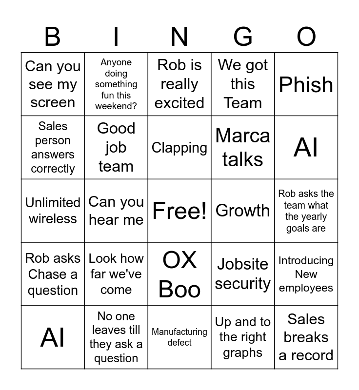 This bingo card has a free space and 29 words: AI, Technical Issues, Can you hear me, How do you change the slide, Can you see my screen, Rob is really excited, Good job team, Look how far we've come, Growth, No one leaves till they ask a question, Rob asks the team what the yearly goals are, Sales breaks a record, Manufacturing defect, Up and to the right graphs, AI, Earth Cam, OX Boo, Rob asks Chase a question, Phish, Unlimited wireless, Jobsite security, Julie talks, Marca talks, Sales person answers correctly, We got this Team, Anyone doing something fun this weekend?, Introducing New employees, Clapping and Turner.