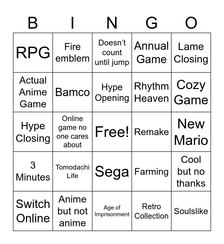 This bingo card has a free space and 35 words: Superhero Game, Rhythm Game, SquareEnix, Bamco, Sega, Annual Game, Actual Anime Game, License Game, Hype Opening, Lame Opening, Hype Closing, Lame Closing, That’s a lotta words, First Person, RPG, Remake, Retro Collection, Online game no one cares about, 3 Minutes, Soulslike, Farming, Switch Online, Cool but no thanks, Anime but not anime, Doesn’t count until jump, Cozy Game, Dead Space (the game), Splatoon Raiders, Rhythm Heaven, New Mario, Metroid Prime 4, Age of Imprisonment, Tomodachi Life, Fire emblem and Rejected Space.