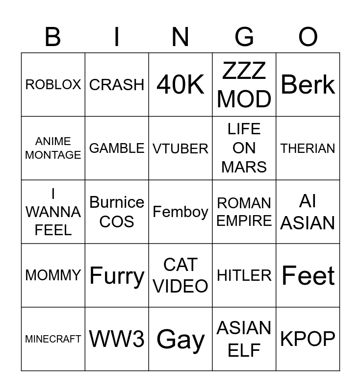 This bingo card has a free space and 24 words: Furry, WW3, VTUBER, MINECRAFT, Berk, ROBLOX, ANIME MONTAGE, CRASH, ROMAN EMPIRE, CAT VIDEO, LIFE ON MARS, I WANNA FEEL, HITLER, Feet, GAMBLE, ASIAN ELF, AI ASIAN, 40K, THERIAN, Burnice COS, KPOP, MOMMY, ZZZ MOD and Gay.