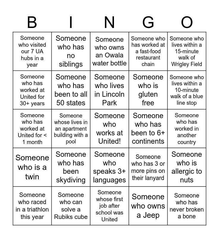 This bingo card has a free space and 56 words: Someone who has had their car towed, Someone who raced in a triathlon this year, Someone who has run a marathon, Someone who visited our 7 UA hubs in a year, Someone whose first job after school was United, Someone who takes the CTA Blue Line to come work at Willis, Someone who has been to all 50 states, Someone who went to a Big 10 college, Someone who is gluten free, Someone wearing mismatched socks, Someone who has worked at a fast-food restaurant chain, Someone who lives in Logan Square, Someone who lives in South Loop, Someone who lives in Old Town, Someone who lives in Ravenswood, Someone who lives in the western suburbs, Someone who lives within a 15-minute walk of Wrigley Field, Someone whose lives in an apartment building with a pool, Someone who has never had a cavity, Someone who has never broken a bone, Someone who has been to 6+ continents, Someone who can juggle, Someone who has 3 or more pins on their lanyard, Someone who owns an Owala water bottle, Someone who bikes to work, Someone who lives in Lincoln Park, Someone who lives in Wicker Park, Someone who lives in the Loop, Someone who lives within a 10-minute walk of a blue line stop, Someone who takes the bus to work, Someone who was in college during covid, Someone who has broken multiple bones, Someone who is not allergic to anything, Someone who is left-handed, Someone who has worked in another country, Someone who has worked at United for 30+ years, Someone who has worked at United for < 1 month, Someone who has worked in 3 other teams at United (not including Ai), Someone who is a twin, Someone who has no siblings, Someone who speaks 3+ languages, Someone who commutes over 1 hour to work, Someone who flew today, Someone who flosses twice a day, every day, Someone who is allergic to cats, Someone who has been skydiving, Someone who can solve a Rubiks cube, Someone who flew standby on this past Sunday, Someone who is wearing a United shirt, Someone who has 3+ kids, Someone who owns a Jeep, Someone who can play 2+ instruments, Someone who has had a bag delayed by United, Someone who has been to Australia, Someone who is allergic to nuts and Someone who has gotten more than 3 parking tickets.
