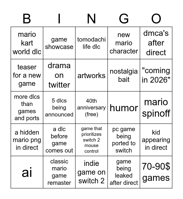 This bingo card has a free space and 24 words: a dlc before game comes out, classic mario game remaster, artworks, ai, dmca's after direct, mario kart world dlc, teaser for a new game, game showcase, humor, game that prioritizes switch 2 mouse control, nostalgia bait, more dlcs than games and ports, pc game being ported to switch, kid appearing in direct, drama on twitter, game being leaked after direct, mario spinoff, tomodachi life dlc, "coming in 2026", 5 dlcs being announced, 70-90$ games, a hidden mario png in direct, new mario character and indie game on switch 2.