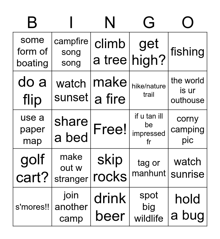 This bingo card has a free space and 24 words: make out w stranger, join another camp, make a fire, s'mores!!, fishing, some form of boating, do a flip, campfire song song, if u tan ill be impressed fr, skip rocks, hike/nature trail, use a paper map, tag or manhunt, watch sunrise, watch sunset, spot big wildlife, corny camping pic, climb a tree, the world is ur outhouse, share a bed, hold a bug, golf cart?, get high? and drink beer.
