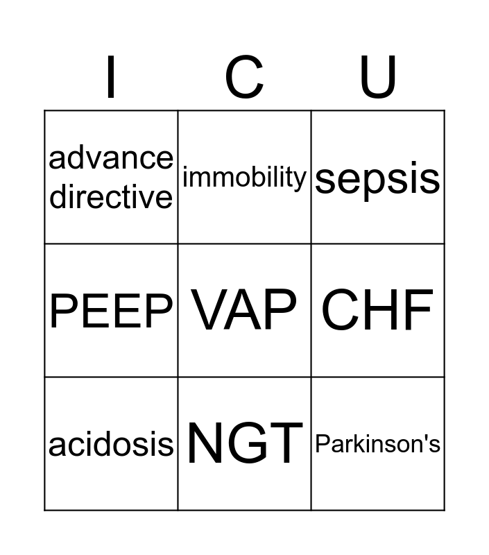 This bingo card has 9 words: acidosis, sepsis, immobility, PEEP, advance directive, CHF, VAP, Parkinson's and NGT.
