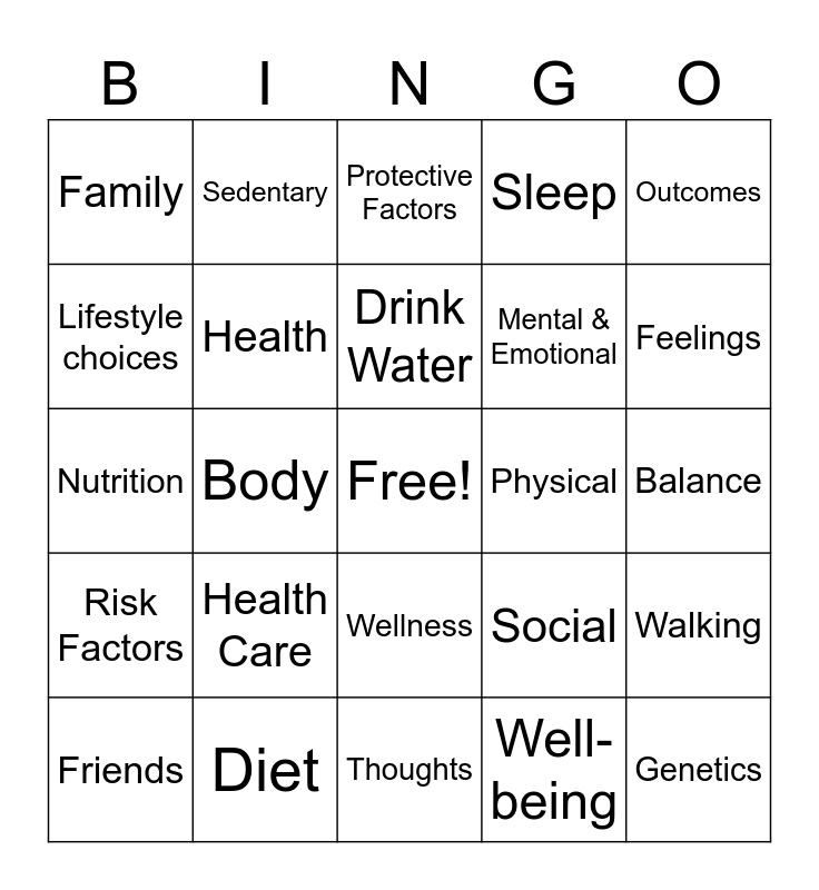 This bingo card has a free space and 29 words: Friends, Preventative, Body, Doctor, Family, Protective Factors, Health, Health Care, Physical, Diet, Balance, Genetics, Thoughts, Well-being, Feelings, Stress, Wellness, Risk Factors, Outcomes, Nutrition, Social, Economical, Mental & Emotional, Lifestyle choices, Sleep, Sedentary, Walking, Drink Water and Tobacco & Alcohol.