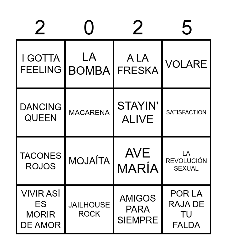 This bingo card has 44 words: LA FLACA, VIVIR ASÍ ES MORIR DE AMOR, NEW YORK, NEW YORK, L'EMPORDÀ, A-Ba-Ni-Bi, SWEET CAROLINE, A LA FRESKA, MAMMA MARIA, DANCING QUEEN, TÀNDEM, VOLARE, JAILHOUSE ROCK, BON DIA, SARANDONGA, RITMO DE LA NOCHE, UN BESO Y UNA FLOR, HELP!, AVE MARÍA, HEY, MOJAÍTA, LA BOMBA, CHIQUILLA, GITANA HECHICERA, I GOTTA FEELING, MAQUILLAJE, AMIGOS PARA SIEMPRE, LA CHICA YEYÉ, WAKA WAKA, WANNABE, POR LA RAJA DE TU FALDA, LA GOZADERA, GASOLINA, AQUÍ NO HAY PLAYA, YO QUIERO BAILAR, LA REVOLUCIÓN SEXUAL, I WANT TO BREAK FREE, A QUIÉN LE IMPORTA, ESPRESSO MACHIATO, SATISFACTION, MACARENA, TACONES ROJOS, MI GRAN NOCHE, STAYIN' ALIVE and OLVÍDAME Y PEGA LA VUELTA.