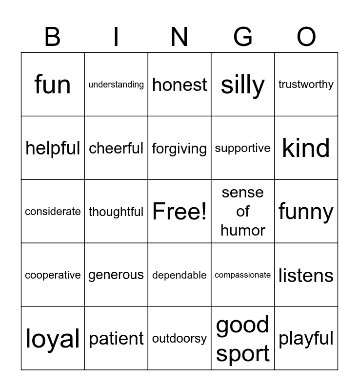 This bingo card has a free space and 29 words: loyal, caring, thoughtful, respectful, fun, honest, cheerful, generous, sense of humor, patient, funny, playful, outdoorsy, good sport, kind, fair, dependable, cooperative, trustworthy, considerate, compassionate, sincere, supportive, helpful, silly, understanding, listens, forgiving and easygoing.