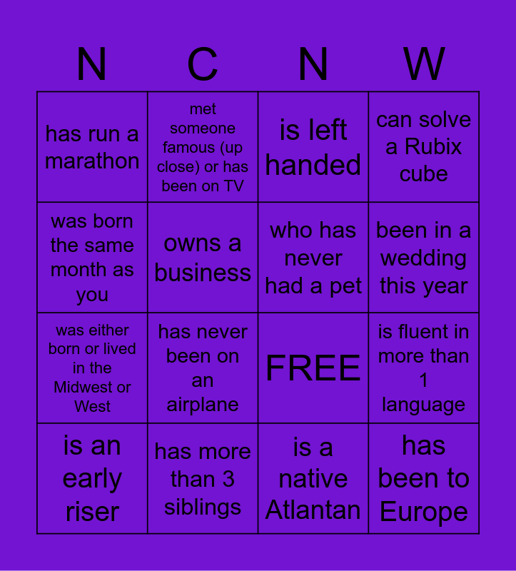 This bingo card has 16 words: has more than 3 siblings, is fluent in more than 1 language, is left handed, has run a marathon, was either born or lived in the Midwest or West, met someone famous (up close) or has been on TV, FREE, is a native Atlantan, was born the same month as you, owns a business, is an early riser, can solve a Rubix cube, has never been on an airplane, been in a wedding this year, who has never had a pet and has been to Europe.