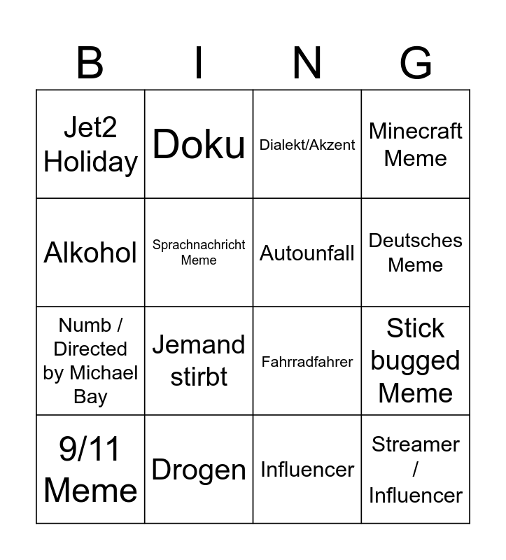 This bingo card has 17 words: Influencer, 9/11 Meme, Dialekt/Akzent, Jet2 Holiday, Jemand stirbt, Minecraft Meme, Stick bugged Meme, Autounfall, Deutsches Meme, Sprachnachricht Meme, Drogen, Fahrradfahrer, Alkohol, Doku, Numb / Directed by Michael Bay, N Wort and Streamer / Influencer.