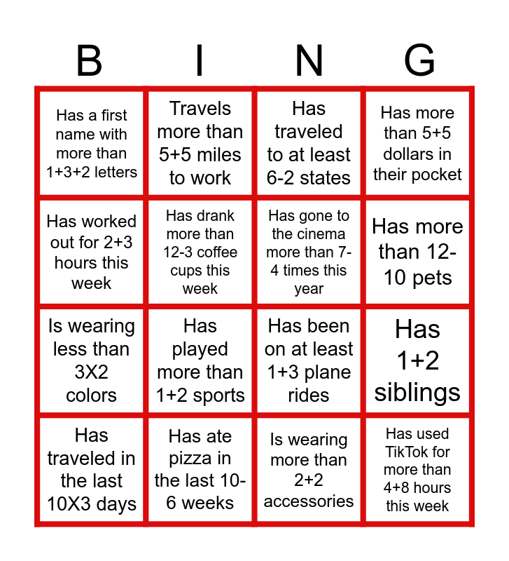 This bingo card has 16 words: Has ate pizza in the last 10- 6 weeks, Has 1+2 siblings, Has traveled to at least 6-2 states, Has a first name with more than 1+3+2 letters, Is wearing less than 3X2 colors, Travels more than 5+5 miles to work, Has been on at least 1+3 plane rides, Is wearing more than 2+2 accessories, Has worked out for 2+3 hours this week, Has drank more than 12-3 coffee cups this week, Has traveled in the last 10X3 days, Has more than 5+5 dollars in their pocket, Has played more than 1+2 sports, Has more than 12-10 pets, Has gone to the cinema more than 7-4 times this year and Has used TikTok for more than 4+8 hours this week.