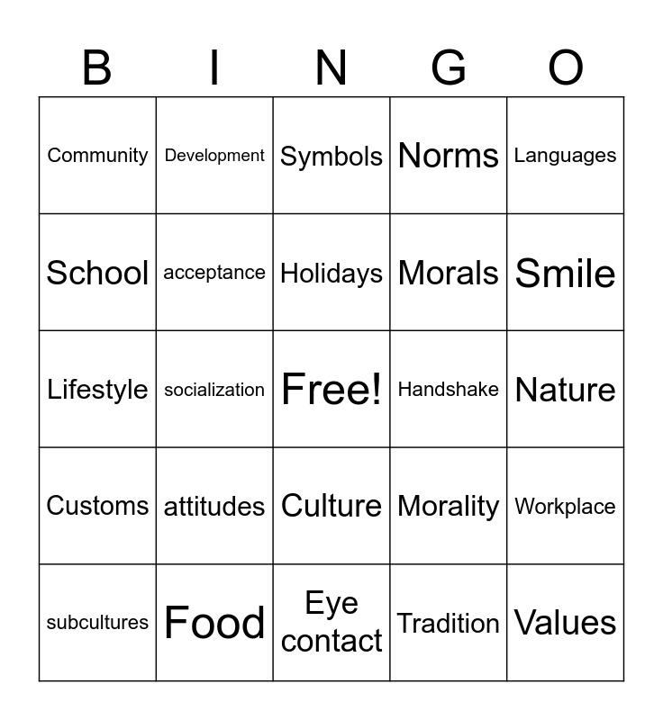 This bingo card has a free space and 26 words: Culture, Tradition, Holidays, Food, Languages, Community, School, Development, Nature, Morality, Morals, Lifestyle, Workplace, subcultures, socialization, interaction, Norms, Customs, Symbols, Values, Smile, Eye contact, Handshake, attitudes, acceptance and nonacceptance.