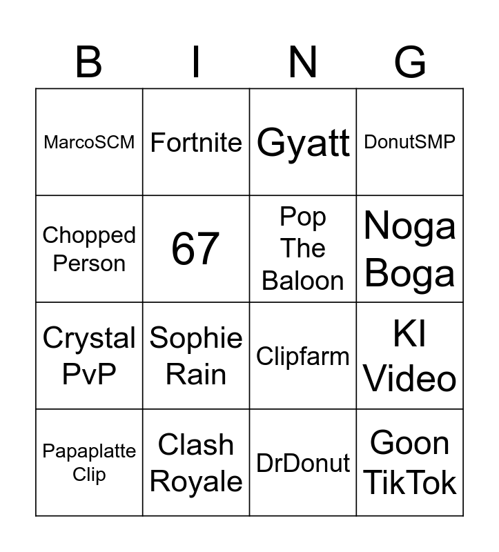 This bingo card has 18 words: Sophie Rain, Goon TikTok, Gyatt, MarcoSCM, Clipfarm, DonutSMP, Papaplatte Clip, Fortnite, Noga Boga, Crystal PvP, DrDonut, Chopped Person, KI Video, 67, Pop The Baloon, Marco_scm Fuß, Clash Royale and Streamer Clip.