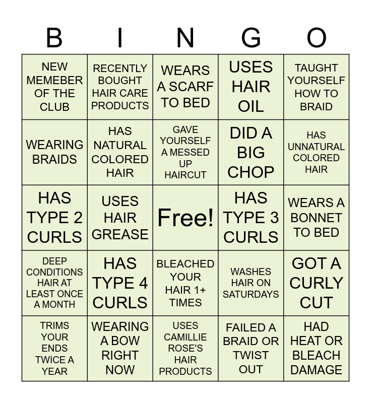 This bingo card has a free space and 24 words: HAS TYPE 4 CURLS, WEARING A BOW RIGHT NOW, GAVE YOURSELF A MESSED UP HAIRCUT, TRIMS YOUR ENDS TWICE A YEAR, TAUGHT YOURSELF HOW TO BRAID, NEW MEMEBER OF THE CLUB, WEARING BRAIDS, RECENTLY BOUGHT HAIR CARE PRODUCTS, HAS TYPE 3 CURLS, BLEACHED YOUR HAIR 1+ TIMES, DID A BIG CHOP, HAS TYPE 2 CURLS, WASHES HAIR ON SATURDAYS, GOT A CURLY CUT, HAS NATURAL COLORED HAIR, FAILED A BRAID OR TWIST OUT, WEARS A BONNET TO BED, WEARS A SCARF TO BED, HAS UNNATURAL COLORED HAIR, USES HAIR GREASE, HAD HEAT OR BLEACH DAMAGE, DEEP CONDITIONS HAIR AT LEAST ONCE A MONTH, USES HAIR OIL and USES CAMILLIE ROSE'S HAIR PRODUCTS.