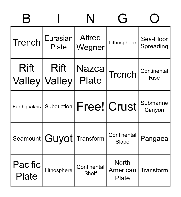 This bingo card has a free space and 29 words: Divergent Boundary, Lithosphere, Alfred Wegner, Mid - Ocean Ridge, Sea-Floor Spreading, Trench, Rift Valley, Nazca Plate, Crust, Pangaea, Pacific Plate, Subduction, North American Plate, Transform, Earthquakes, Continental Margin, Continental Shelf, Continental Slope, Continental Rise, Seamount, Guyot, Volcanic Island, Trench, Submarine Canyon, Rift Valley, Eurasian Plate, Transform, Lithosphere and Continents & Oceans.