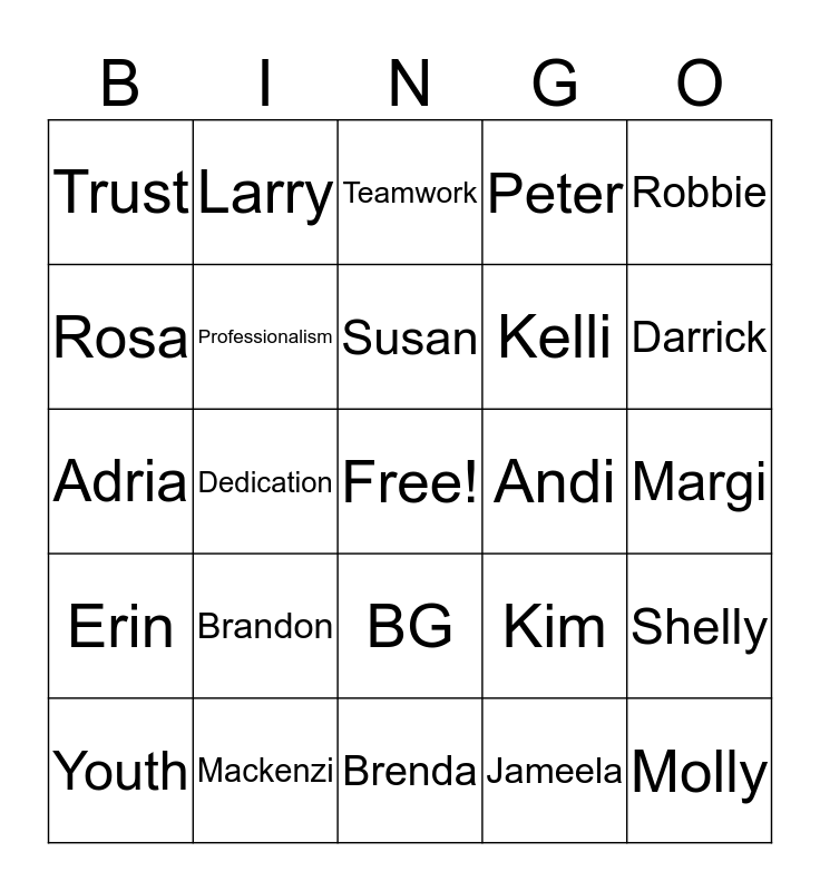 This bingo card has a free space and 29 words: Youth, Home, Dedication, Compassion, Trust, Teamwork, Professionalism, Brandon, Andi, Mackenzi, Margi, Molly, Brenda, Jameela, Darrick, Beth, BG, Erin, Robbie, Adria, Kim, Kelly, Kelli, Rosa, Peter, Larry, Shelly, Susan and Maggie.