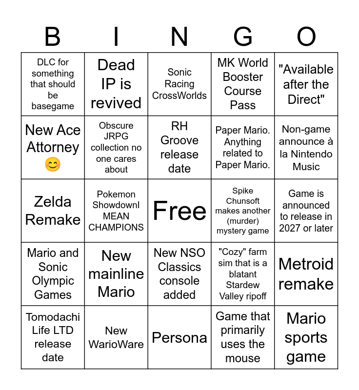 This bingo card has a free space and 24 words: New mainline Mario, New WarioWare, RH Groove release date, Tomodachi Life LTD release date, "Available after the Direct", DLC for something that should be basegame, New Ace Attorney😊, Dead IP is revived, Spike Chunsoft makes another (murder) mystery game, New NSO Classics console added, Paper Mario. Anything related to Paper Mario., Zelda Remake, "Cozy" farm sim that is a blatant Stardew Valley ripoff, Metroid remake, Obscure JRPG collection no one cares about, Game that primarily uses the mouse, Game is announced to release in 2027 or later, Sonic Racing CrossWorlds, Non-game announce à la Nintendo Music, Pokemon ShowdownI MEAN CHAMPIONS, Mario sports game, Mario and Sonic Olympic Games, MK World Booster Course Pass and Persona.