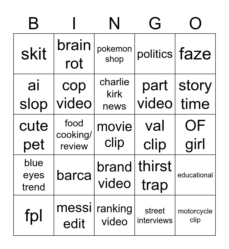 This bingo card has a free space and 24 words: barca, messi edit, charlie kirk news, fpl, faze, skit, ai slop, brain rot, val clip, brand video, part video, cute pet, thirst trap, educational, cop video, street interviews, OF girl, pokemon shop, story time, food cooking/ review, motorcycle clip, blue eyes trend, politics and ranking video.