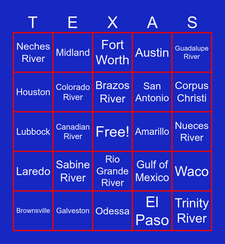This bingo card has a free space and 28 words: Waco, Dallas, San Antonio, El Paso, Houston, Fort Worth, Midland, Laredo, Amarillo, Brownsville, Lubbock, Austin, Galveston, Odessa, Corpus Christi, Red River, Sabine River, Colorado River, Brazos River, Rio Grande River, Neches River, San Antonio River, Trinity River, Canadian River, Nueces River, Gulf of Mexico, Guadalupe River and Pecos River.