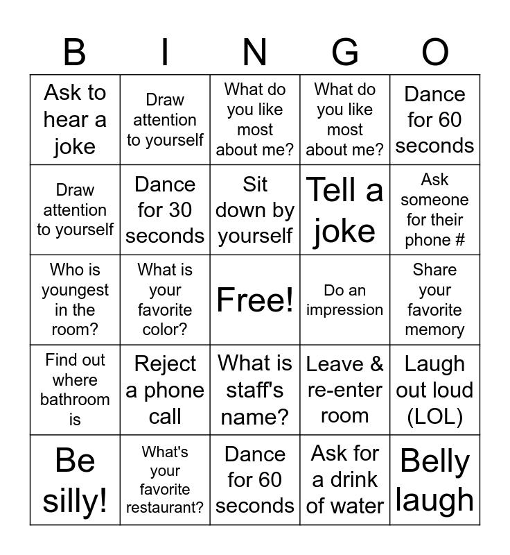 This bingo card has a free space and 29 words: Be silly!, Do you prefer cats or dogs?, What is your favorite color?, Get a middle name, Ask to hear a joke, What do you like most about me?, Dance for 30 seconds, Reject a phone call, Do an impression, What's your favorite restaurant?, Share your favorite memory, Belly laugh, Dance for 60 seconds, Ask for a drink of water, Ask someone for their phone #, Introduce yourself (x5), What is staff's name?, Find out where bathroom is, Dance for 60 seconds, Who is youngest in the room?, Leave & re-enter room, Make a brief toast, Tell a joke, Draw attention to yourself, What do you like most about me?, Draw attention to yourself, Laugh out loud (LOL), Sit down by yourself and Pretend to take a phone call.