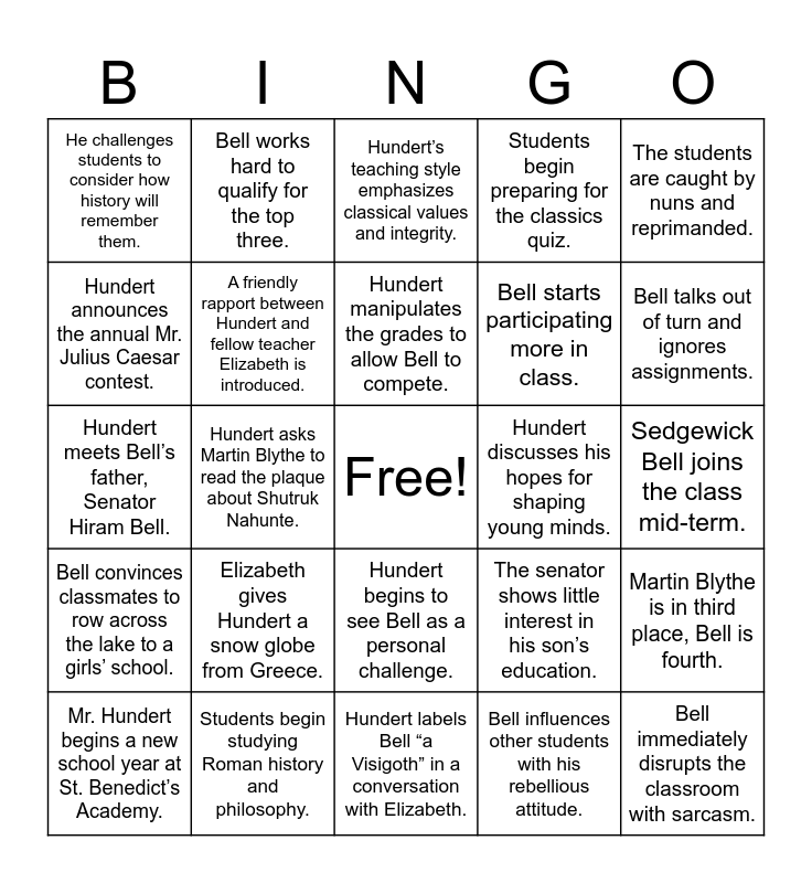 This bingo card has a free space and 29 words: Mr. Hundert begins a new school year at St. Benedict’s Academy., Students file into the classroom and introduce themselves., Hundert asks Martin Blythe to read the plaque about Shutruk Nahunte., Hundert explains the insignificance of conquest without contribution., He challenges students to consider how history will remember them., Hundert’s teaching style emphasizes classical values and integrity., A friendly rapport between Hundert and fellow teacher Elizabeth is introduced., Elizabeth gives Hundert a snow globe from Greece., Hundert discusses his hopes for shaping young minds., Students begin studying Roman history and philosophy., Sedgewick Bell joins the class mid-term., Bell immediately disrupts the classroom with sarcasm., Hundert labels Bell “a Visigoth” in a conversation with Elizabeth., Bell influences other students with his rebellious attitude., Bell talks out of turn and ignores assignments., Bell’s defiance challenges Hundert’s authority., Hundert begins to see Bell as a personal challenge., Bell convinces classmates to row across the lake to a girls’ school., The students are caught by nuns and reprimanded., Hundert meets Bell’s father, Senator Hiram Bell., The senator shows little interest in his son’s education., Hundert decides to mentor Bell more closely., Bell starts participating more in class., Hundert announces the annual Mr. Julius Caesar contest., Students begin preparing for the classics quiz., Bell works hard to qualify for the top three., Martin Blythe is in third place, Bell is fourth., Hundert manipulates the grades to allow Bell to compete. and Blythe is quietly displaced from the competition..
