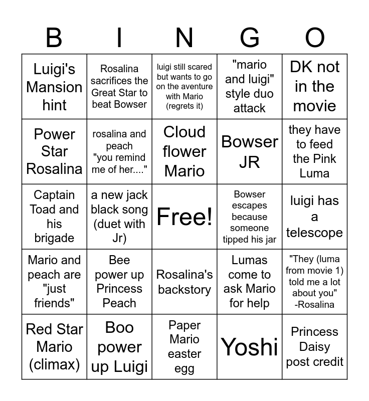 This bingo card has a free space and 24 words: Bee power up Princess Peach, Boo power up Luigi, Cloud flower Mario, Red Star Mario (climax), DK not in the movie, Luigi's Mansion hint, Power Star Rosalina, Rosalina sacrifices the Great Star to beat Bowser, Bowser escapes because someone tipped his jar, Rosalina's backstory, Bowser JR, Captain Toad and his brigade, Lumas come to ask Mario for help, "They (luma from movie 1) told me a lot about you" -Rosalina, rosalina and peach "you remind me of her....", Yoshi, luigi has a telescope, luigi still scared but wants to go on the aventure with Mario (regrets it), they have to feed the Pink Luma, a new jack black song (duet with Jr), Princess Daisy post credit, Mario and peach are "just friends", "mario and luigi" style duo attack and Paper Mario easter egg.