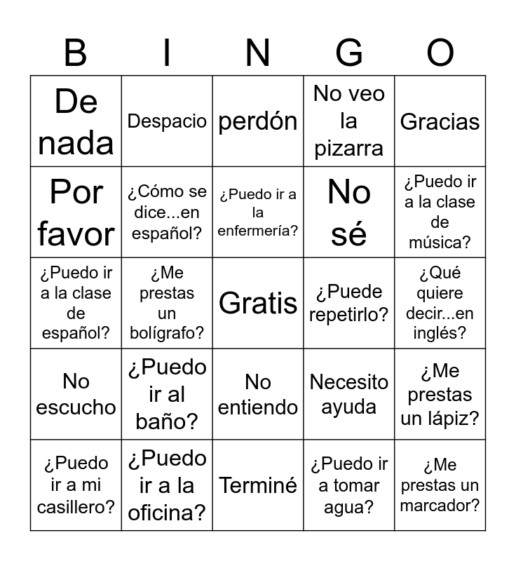 This bingo card has a free space and 24 words: ¿Puedo ir al baño?, ¿Puedo ir a la oficina?, ¿Puedo ir a la enfermería?, ¿Puedo ir a mi casillero?, Gracias, De nada, Por favor, Despacio, ¿Puede repetirlo?, No entiendo, No sé, ¿Puedo ir a la clase de español?, Necesito ayuda, ¿Me prestas un lápiz?, ¿Cómo se dice...en español?, ¿Puedo ir a tomar agua?, ¿Qué quiere decir...en inglés?, perdón, ¿Puedo ir a la clase de música?, ¿Me prestas un bolígrafo?, ¿Me prestas un marcador?, No escucho, No veo la pizarra and Terminé.