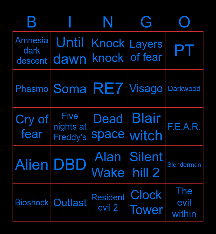 This bingo card has a free space and 24 words: DBD, Outlast, RE7, Bioshock, PT, Amnesia dark descent, Phasmo, Until dawn, Blair witch, Alan Wake, Visage, Cry of fear, Silent hill 2, Slenderman, Soma, Clock Tower, F.E.A.R., Knock knock, Darkwood, Five nights at Freddy's, The evil within, Alien, Layers of fear and Resident evil 2.