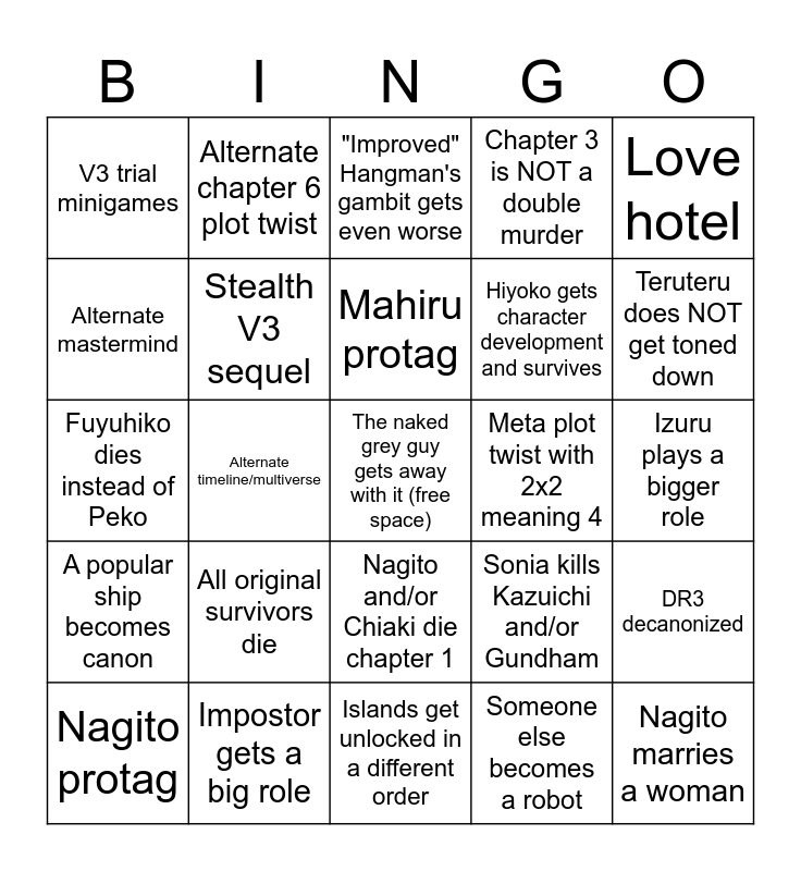 This bingo card has a free space and 24 words: All original survivors die, Impostor gets a big role, Mahiru protag, Nagito protag, Love hotel, V3 trial minigames, Alternate mastermind, Alternate chapter 6 plot twist, Meta plot twist with 2x2 meaning 4, Nagito and/or Chiaki die chapter 1, Hiyoko gets character development and survives, Fuyuhiko dies instead of Peko, Sonia kills Kazuichi and/or Gundham, DR3 decanonized, Stealth V3 sequel, Someone else becomes a robot, Izuru plays a bigger role, "Improved" Hangman's gambit gets even worse, Teruteru does NOT get toned down, Alternate timeline/multiverse, Nagito marries a woman, A popular ship becomes canon, Chapter 3 is NOT a double murder and Islands get unlocked in a different order.
