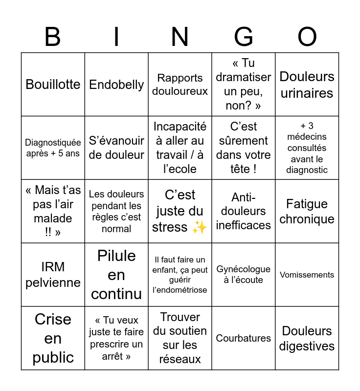 This bingo card has a free space and 24 words: Pilule en continu, « Tu veux juste te faire prescrire un arrêt », Incapacité à aller au travail / à l’ecole, Crise en public, Douleurs urinaires, Bouillotte, Diagnostiquée après + 5 ans, Endobelly, Anti-douleurs inefficaces, Il faut faire un enfant, ça peut guérir l’endométriose, C’est sûrement dans votre tête !, « Mais t’as pas l’air malade !! », Gynécologue à l’écoute, Vomissements, S’évanouir de douleur, Courbatures, Fatigue chronique, Rapports douloureux, + 3 médecins consultés avant le diagnostic, Les douleurs pendant les règles c’est normal, Douleurs digestives, IRM pelvienne, « Tu dramatiser un peu, non? » and Trouver du soutien sur les réseaux.