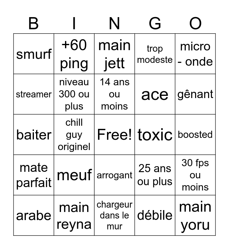 This bingo card has a free space and 24 words: meuf, main reyna, 14 ans ou moins, arabe, micro - onde, smurf, streamer, +60 ping, toxic, arrogant, ace, baiter, 25 ans ou plus, 30 fps ou moins, niveau 300 ou plus, débile, boosted, main jett, gênant, chill guy originel, main yoru, mate parfait, trop modeste and chargeur dans le mur.