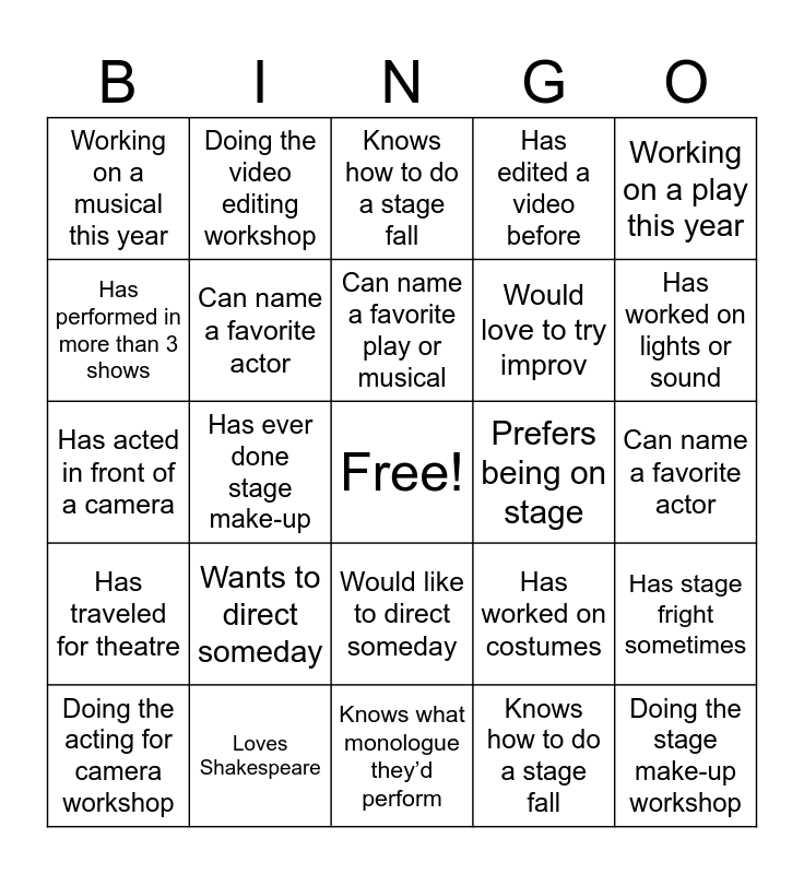 This bingo card has a free space and 29 words: Doing the acting for camera workshop, Involved in a comedy show at their school, Has ever done stage make-up, Likes editing videos on their phone, Working on a musical this year, Knows how to do a stage fall, Can name a favorite actor, Wants to direct someday, Prefers being on stage, Loves Shakespeare, Can name a favorite actor, Doing the stage make-up workshop, Knows what monologue they’d perform, Knows how to do a stage fall, Has worked on lights or sound, Is excited for today’s workshops, Would like to direct someday, Has traveled for theatre, Working on a play this year, Has acted in front of a camera, Has worked on costumes, Likes working backstage, Would love to try improv, Has performed in more than 3 shows, Has edited a video before, Doing the video editing workshop, Has stage fright sometimes, Can name a favorite play or musical and Working on a musical this year.