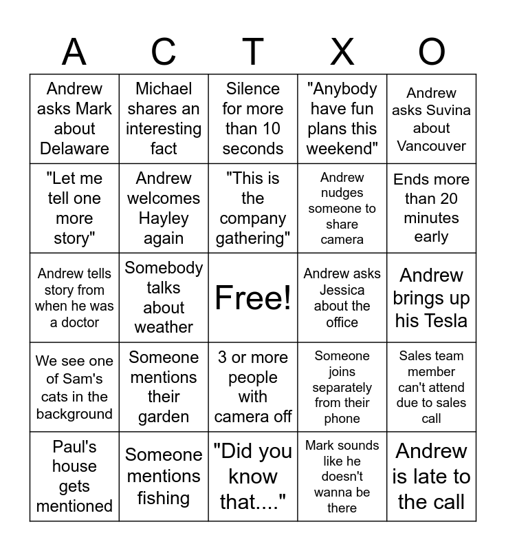 This bingo card has a free space and 24 words: Someone mentions their garden, Someone mentions fishing, "This is the company gathering", Paul's house gets mentioned, Andrew asks Suvina about Vancouver, Andrew asks Mark about Delaware, "Let me tell one more story", Michael shares an interesting fact, Andrew asks Jessica about the office, 3 or more people with camera off, Andrew nudges someone to share camera, Andrew tells story from when he was a doctor, Someone joins separately from their phone, Sales team member can't attend due to sales call, Andrew welcomes Hayley again, Mark sounds like he doesn't wanna be there, Andrew brings up his Tesla, Silence for more than 10 seconds, Ends more than 20 minutes early, Somebody talks about weather, Andrew is late to the call, We see one of Sam's cats in the background, "Anybody have fun plans this weekend" and "Did you know that....".