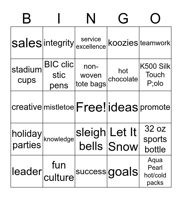 This bingo card has a free space and 24 words: knowledge, fun culture, non-woven tote bags, leader, teamwork, sales, stadium cups, integrity, ideas, sleigh bells, hot chocolate, creative, Let It Snow, 32 oz sports bottle, BIC clic stic pens, goals, promote, service excellence, K500 Silk Touch P;olo, mistletoe, Aqua Pearl hot/cold packs, holiday parties, koozies and success.