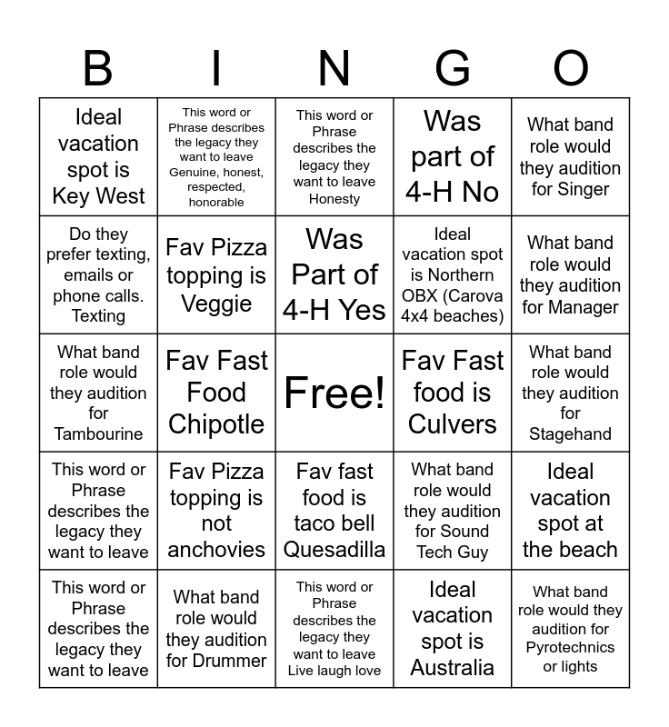 This bingo card has a free space and 43 words: This word or Phrase describes the legacy they want to leave Helpful, What band role would they audition for Pyrotechnics or lights, Fav Pizza topping is Bacon, This word or Phrase describes the legacy they want to leave, Teach my kids how to raise my grandkids, Ideal vacation spot is Australia, This word or Phrase describes the legacy they want to leave Honesty, Fav Pizza topping is Pineapple, What band role would they audition for Singer, What band role would they audition for Drummer, Was part of 4-H No, Fav Fast food is Culvers, Fav fast food is taco bell Quesadilla, Fav Pizza topping is not anchovies, Ideal vacation spot is Dominican Republic, This word or Phrase describes the legacy they want to leave Live laugh love, Ideal vacation spot is Mexico on the beach, What band role would they audition for Tambourine, Fav Pizza topping is Mushrooms, What band role would they audition for Manager, This word or Phrase describes the legacy they want to leave Genuine, honest, respected, honorable, Do they prefer texting, emails or phone calls Phone calls, Ideal Vacation Spot Hawaii, Ideal vacation spot is Key West, Would Rather drive for less than 8 hour trip, What band role would they audition for Stagehand, Fav Pizza topping is Green olives, Ideal vacation spot is Carribean Island, What band role would they audition for Sound Tech Guy, This word or Phrase describes the legacy they want to leave, Fearlessly Authentic, Ideal vacation spot at the beach, What band role would they audition for Rodie, Fav Fast Food Chipotle, This word or Phrase describes the legacy they want to leave Be authentic, This word or Phrase describes the legacy they want to leave Love, This word or Phrase describes the legacy they want to leave Integrity, Was Part of 4-H Yes, Do they prefer texting, emails or phone calls. Texting, Ideal vacation spot is Northern OBX (Carova 4x4 beaches), Fav fast food is Chik Fil A, Fav Pizza topping is Veggie and Ideal vacation spot is Michigan.
