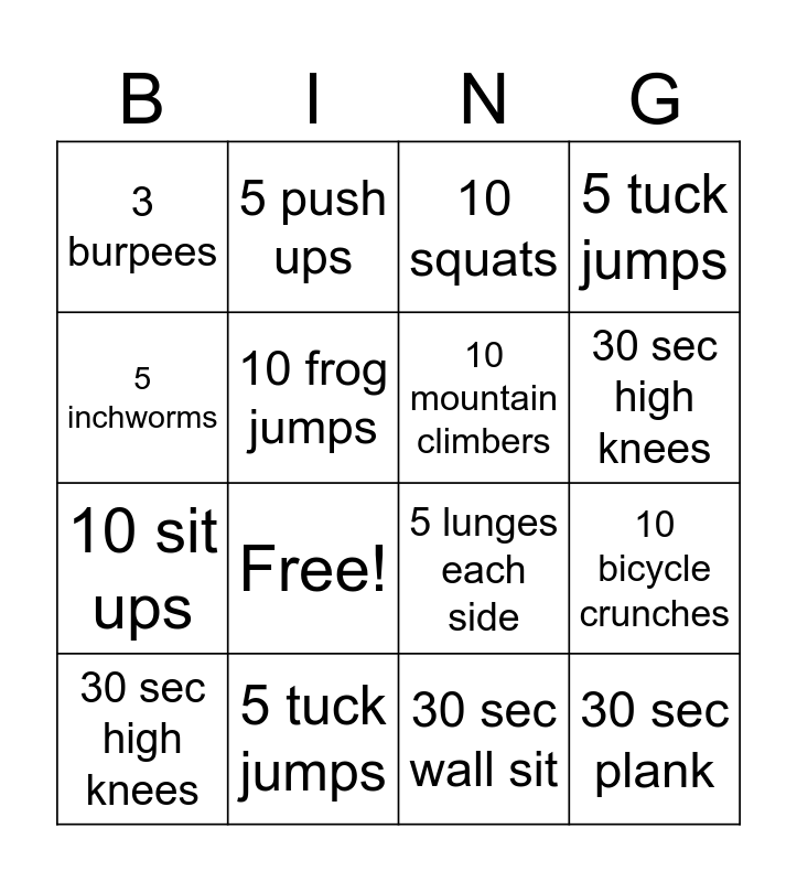 This bingo card has 19 words: 5 lunges each side, 10 jumping jacks, 10 squats, 30 sec plank, 10 bicycle crunches, 5 inchworms, 30 sec wall sit, 3 burpees, 5 push ups, 10 sit ups, Free!, 10 frog jumps, 10 mountain climbers, 5 tuck jumps, 30 sec high knees, 10 crunches, 5 tuck jumps, 30 sec high knees and 10 mountain climbers.