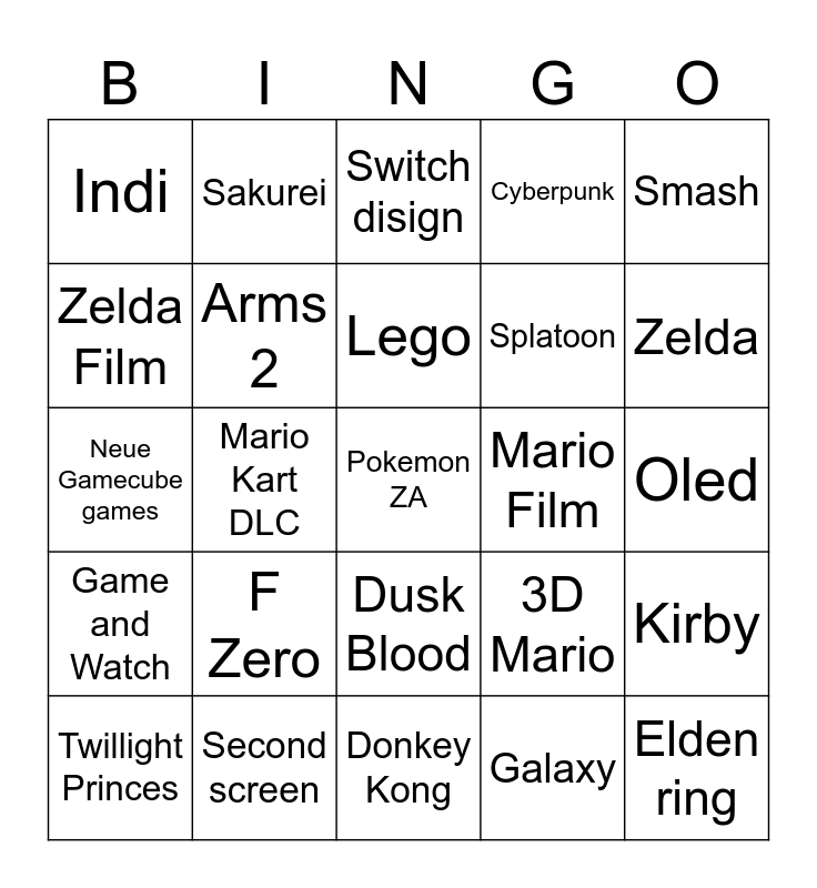 This bingo card has a free space and 24 words: F Zero, Second screen, Lego, Twillight Princes, Smash, Indi, Zelda Film, Sakurei, Mario Film, Dusk Blood, Splatoon, Neue Gamecube games, 3D Mario, Kirby, Arms 2, Galaxy, Oled, Switch disign, Zelda, Mario Kart DLC, Elden ring, Game and Watch, Cyberpunk and Donkey Kong.