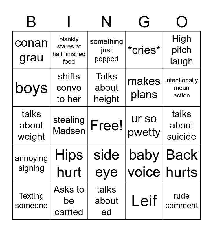 This bingo card has a free space and 24 words: Hips hurt, Asks to be carried, Talks about height, Texting someone, High pitch laugh, conan grau, boys, blankly stares at half finished food, ur so pwetty, side eye, makes plans, talks about weight, baby voice, Back hurts, shifts convo to her, Leif, talks about suicide, something just popped, intentionally mean action, stealing Madsen, rude comment, annoying signing, *cries* and talks about ed.