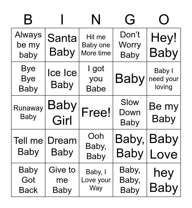 This bingo card has a free space and 24 words: Dream Baby, Give to me Baby, I got you Babe, Baby Got Back, Hey! Baby, Always be my baby, Bye Bye Baby, Santa Baby, Slow Down Baby, Ooh Baby, Baby, Baby, Runaway Baby, Baby, Baby, Baby Love, Ice Ice Baby, Baby, Baby, Baby, Be my Baby, Hit me Baby one More time, Baby I need your loving, Baby Girl, hey Baby, Tell me Baby, Don’t Worry Baby and Baby, I Love your Way.