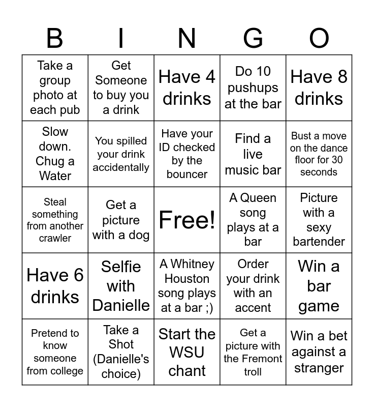 This bingo card has a free space and 24 words: Selfie with Danielle, Take a Shot (Danielle's choice), Have your ID checked by the bouncer, Pretend to know someone from college, Have 8 drinks, Take a group photo at each pub, Slow down. Chug a Water, Get Someone to buy you a drink, A Queen song plays at a bar, A Whitney Houston song plays at a bar ;), Find a live music bar, Steal something from another crawler, Order your drink with an accent, Win a bar game, You spilled your drink accidentally, Get a picture with the Fremont troll, Picture with a sexy bartender, Have 4 drinks, Bust a move on the dance floor for 30 seconds, Get a picture with a dog, Win a bet against a stranger, Have 6 drinks, Do 10 pushups at the bar and Start the WSU chant.