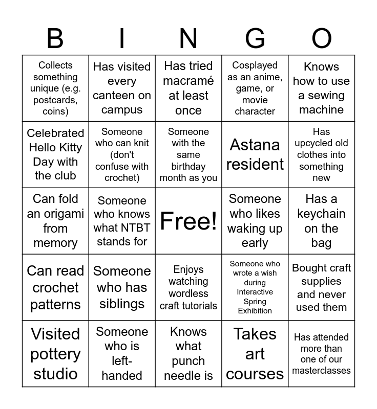 This bingo card has a free space and 24 words: Someone who has siblings, Someone who is left- handed, Someone with the same birthday month as you, Visited pottery studio, Knows how to use a sewing machine, Collects something unique (e.g. postcards, coins), Celebrated Hello Kitty Day with the club, Has visited every canteen on campus, Someone who likes waking up early, Enjoys watching wordless craft tutorials, Astana resident, Can fold an origami from memory, Someone who wrote a wish during Interactive Spring Exhibition, Bought craft supplies and never used them, Someone who can knit (don't confuse with crochet), Takes art courses, Has a keychain on the bag, Has tried macramé at least once, Has upcycled old clothes into something new, Someone who knows what NTBT stands for, Has attended more than one of our masterclasses, Can read crochet patterns, Cosplayed as an anime, game, or movie character and Knows what punch needle is.