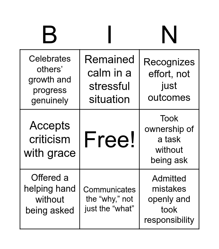 This bingo card has a free space and 8 words: Took ownership of a task without being ask, Recognizes effort, not just outcomes, Remained calm in a stressful situation, Offered a helping hand without being asked, Celebrates others’ growth and progress genuinely, Admitted mistakes openly and took responsibility, Accepts criticism with grace and Communicates the “why,” not just the “what”.