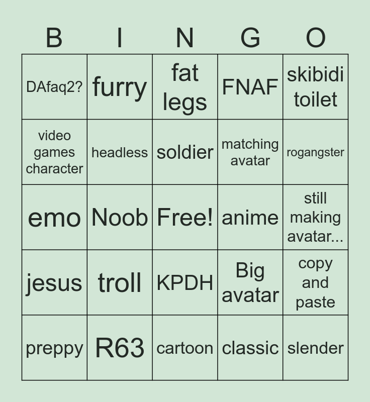 This bingo card has a free space and 24 words: troll, R63, soldier, preppy, skibidi toilet, DAfaq2?, video games character, furry, anime, KPDH, matching avatar, emo, Big avatar, copy and paste, headless, classic, still making avatar..., fat legs, rogangster, Noob, slender, jesus, FNAF and cartoon.