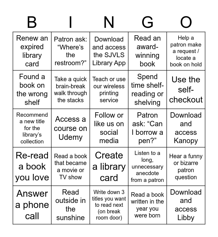 This bingo card has 25 words: Read a book that became a movie or TV show, Write down 3 titles you want to read next (on break room door), Teach or use our wireless printing service, Answer a phone call, Help a patron make a request / locate a book on hold, Renew an expired library card, Found a book on the wrong shelf, Patron ask: “Where’s the restroom?”, Patron ask: “Can I borrow a pen?”, Create a library card, Spend time shelf-reading or shelving, Recommend a new title for the library’s collection, Listen to a long, unnecessary anecdote from a patron, Hear a funny or bizarre patron question, Take a quick brain-break walk through the stacks, Download and access Libby, Download and access Kanopy, Download and access the SJVLS Library App, Use the self-checkout, Access a course on Udemy, Follow or like us on social media, Read outside in the sunshine, Re-read a book you love, Read an award-winning book and Read a book written in the year you were born.