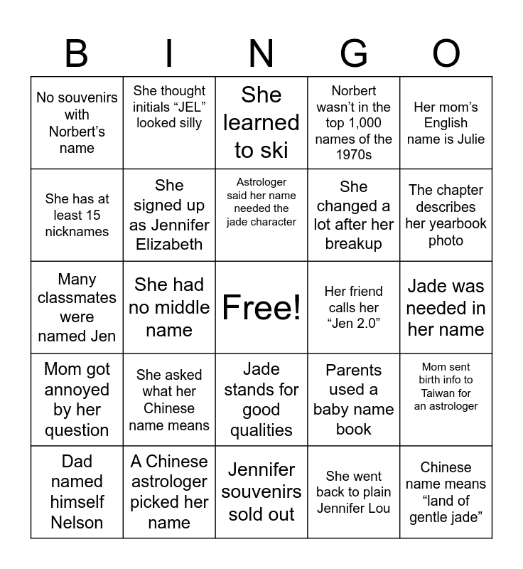 This bingo card has a free space and 29 words: Dad named himself Nelson, Brother’s name is Norbert, She had no middle name, “Jennifer” means “the fair one”, No souvenirs with Norbert’s name, She learned to ski, She signed up as Jennifer Elizabeth, She asked what her Chinese name means, Her friend calls her “Jen 2.0”, A Chinese astrologer picked her name, Jade was needed in her name, Chinese name means “land of gentle jade”, Jennifer souvenirs sold out, She went back to plain Jennifer Lou, The chapter describes her yearbook photo, She learned to play tennis, Jade stands for good qualities, Mom got annoyed by her question, Her mom’s English name is Julie, Many classmates were named Jen, Parents used a baby name book, All family English names start with N, She changed a lot after her breakup, She has at least 15 nicknames, Norbert wasn’t in the top 1,000 names of the 1970s, She thought initials “JEL” looked silly, Mom sent birth info to Taiwan for an astrologer, Astrologer said her name needed the jade character and She once wore a pink pair of thick glasses.