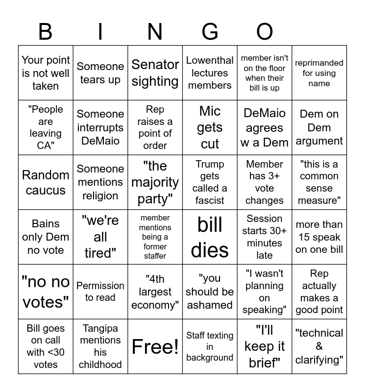 This bingo card has 39 words: Tangipa mentions his childhood, Bill goes on call with <30 votes, Bill gets called fraud, "People are leaving CA", member mentions being a former staffer, "this is a common sense measure", Someone interrupts DeMaio, "technical & clarifying", member isn't on the floor when their bill is up, Trump gets called a fascist, Dem on Dem argument, Lowenthal lectures members, Random caucus, "the majority party", Someone mentions religion, Member has 3+ vote changes, "I wasn't planning on speaking", Your point is not well taken, Free!, Bains only Dem no vote, reprimanded for using name, Session starts 30+ minutes late, Rep raises a point of order, Mic gets cut, Staff texting in background, "4th largest economy", "no no votes", "I'll keep it brief", Permission to read, Someone tears up, less than 15 second floor speech, Rep actually makes a good point, Senator sighting, bill dies, more than 15 speak on one bill, "you should be ashamed, "we're all tired", DeMaio agrees w a Dem and Presiding officer doesn't see a mic.