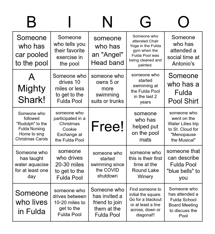 This bingo card has a free space and 25 words: someone who drives 20-30 miles to get to the Fulda Pool, Someone who has invited a friend to join them at the Fulda Pool, someone who owns 5 or more swimming suits or trunks, Someone who lives in Fulda, Someone who has attended a social time at Antonio's, Someone who has car pooled to the pool, A Mighty Shark!, Someone who tells you their favorite exercise in the pool, someone who has helped put on the pool mats, someone who started swimming since the COVID shutdown, someone who started swimming at the Fulda Pool in the last 2 years, Someone who followed "Rudolph" to the Fulda Nursing Home to sing Christmas Carols, someone who this is their first time at the Round Lake Winery, someone that can describe Fulda Pool "blue bells" to you, Someone who drives 10 miles or less to get to the Fulda Pool, someone who has helped take off the pool mats, someone who went on the Water Lilies trip to St. Cloud for "Menopause the Musical", someone who has an "Angel" Head band, Someone who has a Fulda Pool Shirt, someone who participated in a Christmas Cookie Exchange at the Fulda Pool, Someone who has attended a Fulda School Board Meeting to discuss the Pool, someone who drives between 10-20 miles to get to the Fulda Pool, Someone who has taught water aquacise for at least one day, Someone who attended Chair Yoga in the Fulda gym when the Fulda Pool was being cleaned and painted. and Find someone to initial the square. Go for a blackout or at least a line across, down or diagonal!!.