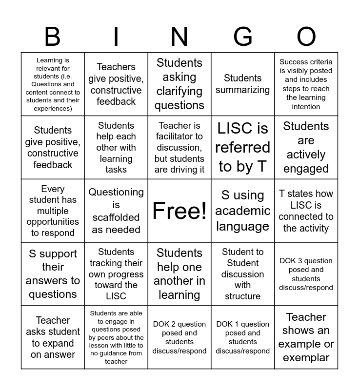 This bingo card has a free space and 24 words: Students tracking their own progress toward the LISC, Students are able to engage in questions posed by peers about the lesson with little to no guidance from teacher, Teacher is facilitator to discussion, but students are driving it, Teacher asks student to expand on answer, Success criteria is visibly posted and includes steps to reach the learning intention, Learning is relevant for students (i.e. Questions and content connect to students and their experiences), Students give positive, constructive feedback, Teachers give positive, constructive feedback, S using academic language, Students help one another in learning, LISC is referred to by T, Every student has multiple opportunities to respond, Student to Student discussion with structure, DOK 3 question posed and students discuss/respond, Students help each other with learning tasks, DOK 1 question posed and students discuss/respond, T states how LISC is connected to the activity, Students asking clarifying questions, Students are actively engaged, Questioning is scaffolded as needed, Teacher shows an example or exemplar, S support their answers to questions, Students summarizing and DOK 2 question posed and students discuss/respond.